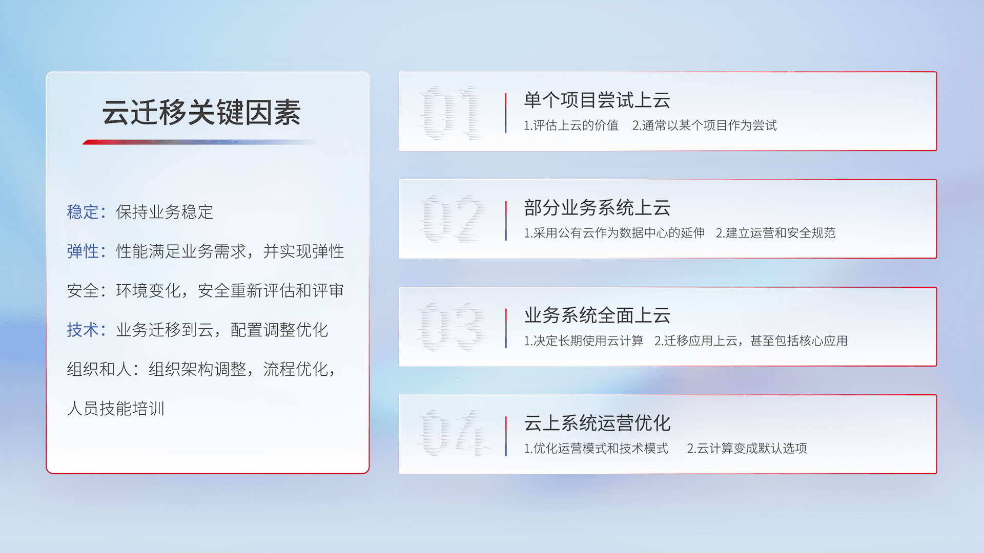 结合实际业务,,,从规划设计、、、云平台选型、、、云原生改造、、数据迁移、、集成交付,,迁移全过程为客户识别最佳上云路径,,,做好风险识别管理,,设计网络架构、、、、身份权限、、、安全审计合规、、、、操作审计、、、、日志审计、、监控告警策略、、多站点容灾设计等,,,,对云上基础设施进行整体规划,,,提升IT治理水平,,,以满足弹性、、、、高可用、、、高性能的需求。。