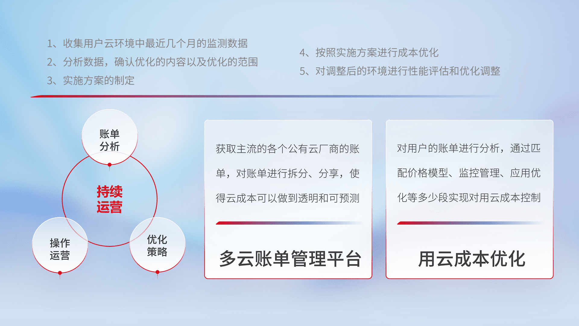 通过多云纳管,,,,以统一的资源数据模型把客户的云资源进行抽象和封装,,,进而实现对多云资源的统一操作,,,,保障云资源管理的可靠性、、、、稳定性与可用性。。。量身定制化运维内容,,配置、、、开发运维、、补丁管理、、备份、、、监控、、认证和访问管理、、、、审计和日常巡检等,,,,保障在用云过程中的可靠度,,稳定度以及高可用率。。。。